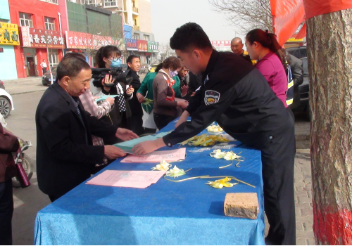 在清明时节,大家会按照传统的方式祭奠逝去的亲人,但也会造成污染甚至存在重大的安全隐患。因此,海达社区在新天地市场门前举办了“倡导文明殡葬,推行绿色祭祀”的活动。工作人员们为过往的居民发放了文明祭祀的倡议书,在各小区宣传栏内张贴了倡议书,在路边悬挂了宣传条幅,倡议大家文明祭祀,科学祭祀,环保祭祀,节俭祭祀,安全祭祀。努力营造健康、绿色的生活环境,共度一个文明、安全、和谐的清明节。