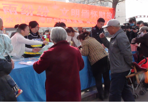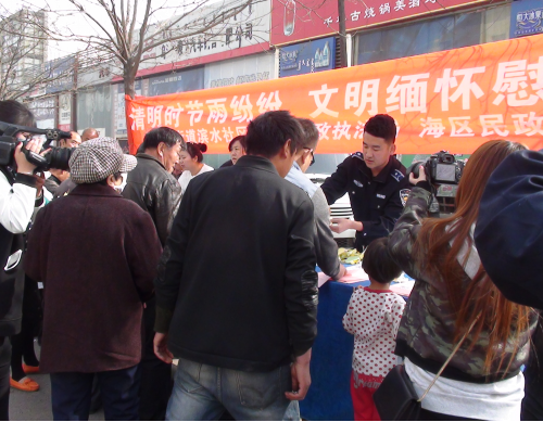 滨水社区联合海区执法局、海区民政局、辖区志愿者和在职党员在海达家苑A区外开展形式多样向居民宣传“低碳清明 文明祭祀”活动。志愿者们纷纷向过往居民发放“文明祭扫,环保优先倡议书”、《殡葬管理条例》、“海区禁拜焚烧处平面图”鲜花束、黄丝带、心愿卡等。并积极向大家宣传环保文明的祭扫方式,如以鲜花束、黄丝带、心愿卡等替代锡箔纸钱、香烛贡品和鞭炮;植树祭奠、网上祭祀、公祭悼念等文明祭扫活动。这样既节约资源的同时,又避免了潜在的安全隐患。倡议通过QQ群、微博、微信等方式互动宣传。通过这次活动,让居民朋友了解了清明节的现代纪念方式,过一个“耳目一新”的清明节。